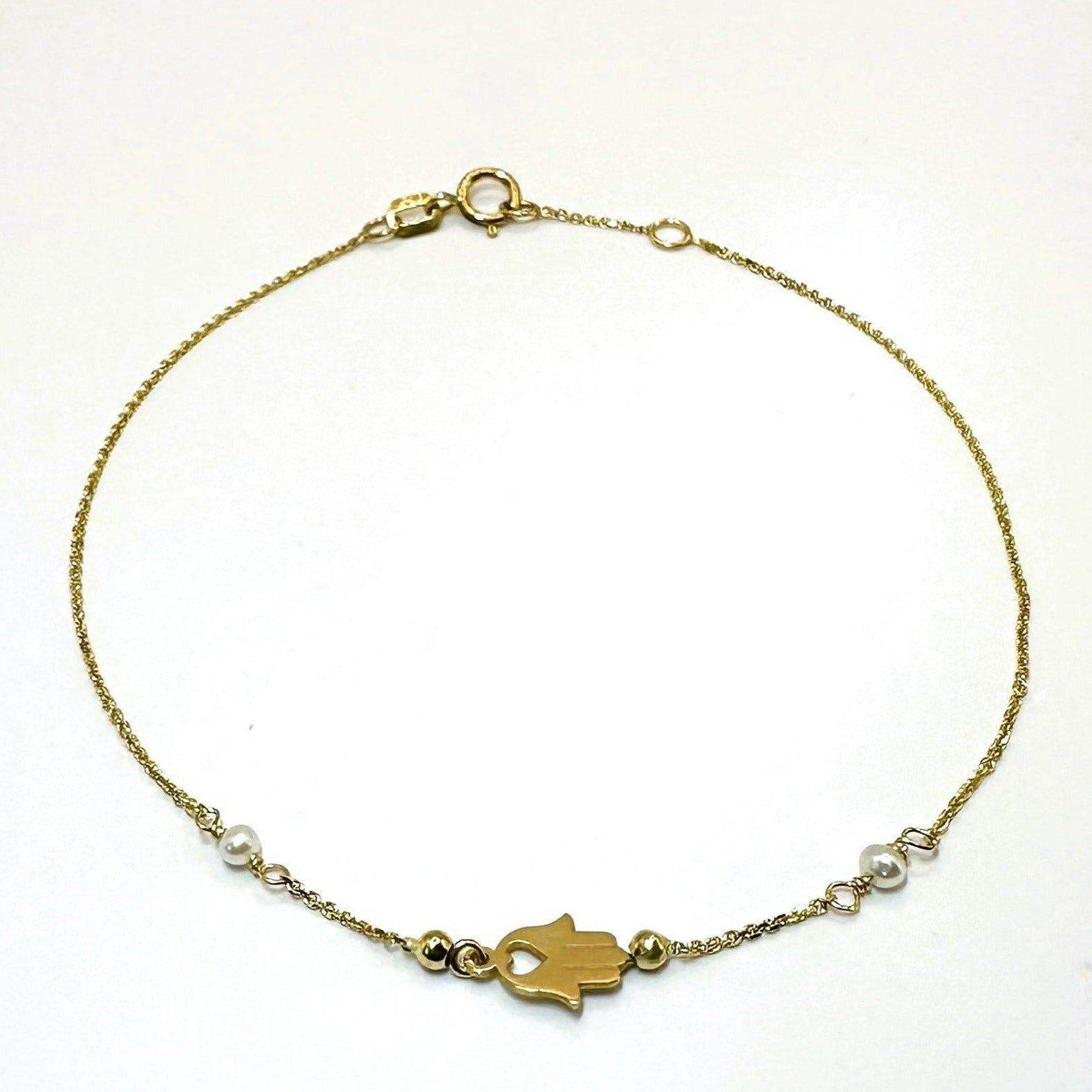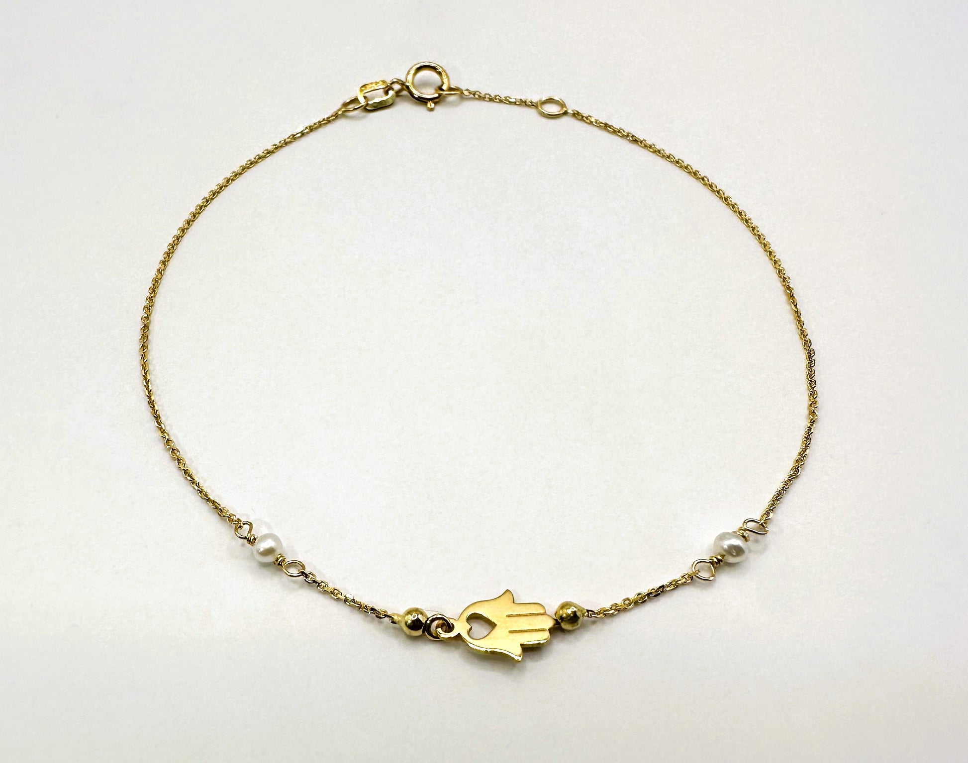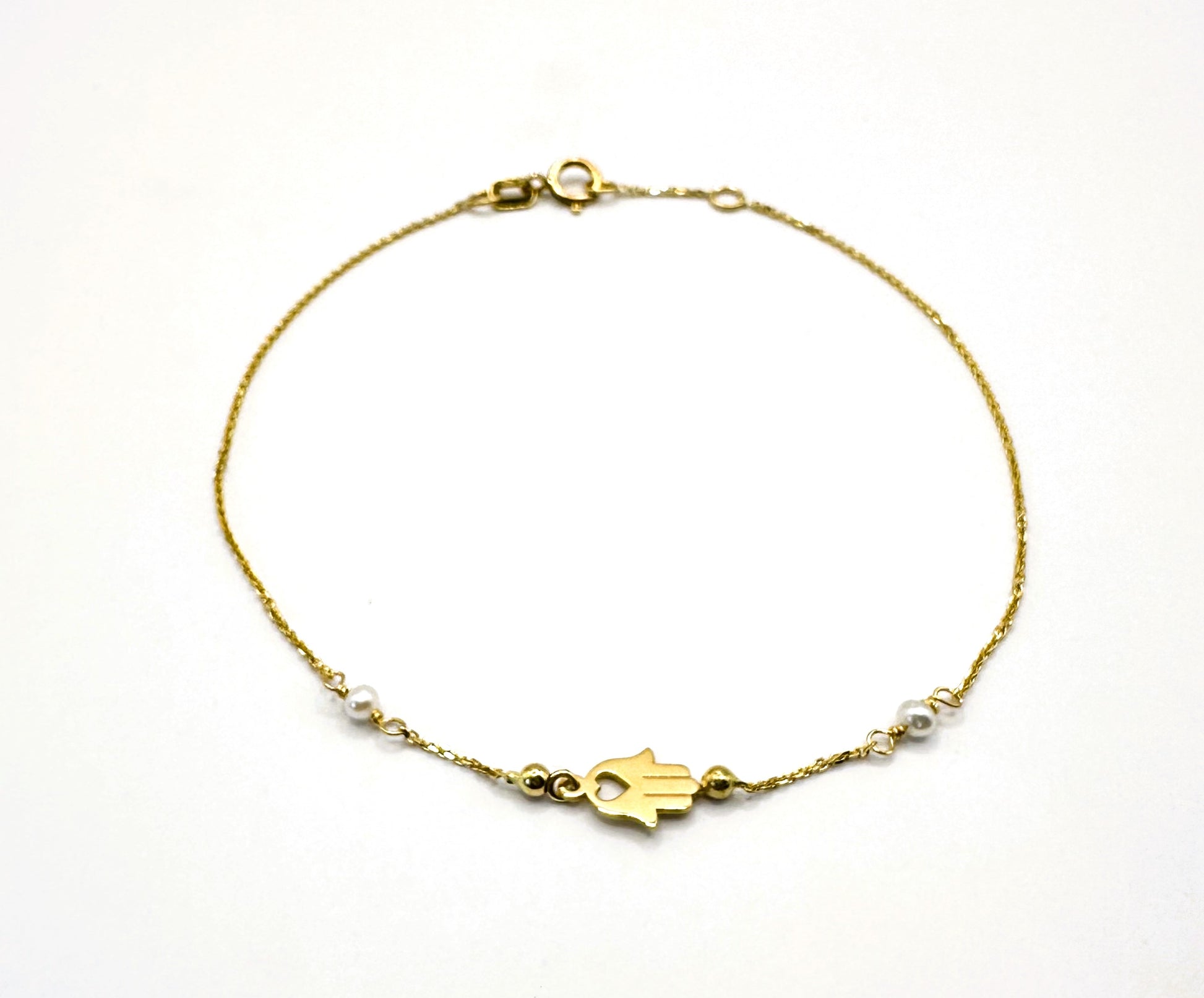 18k solid gold hamza and pearl charm bracelet - 750 hallmarked.