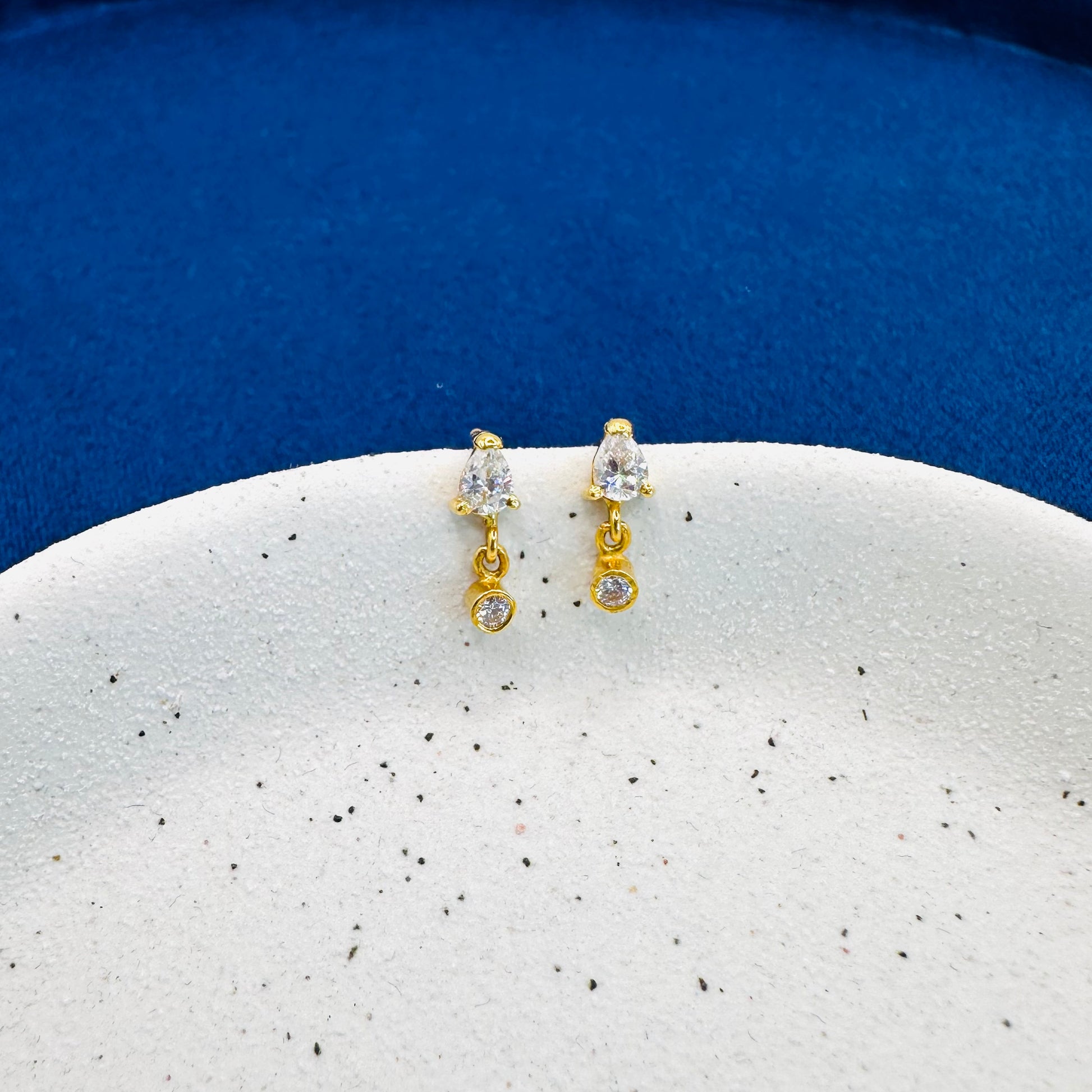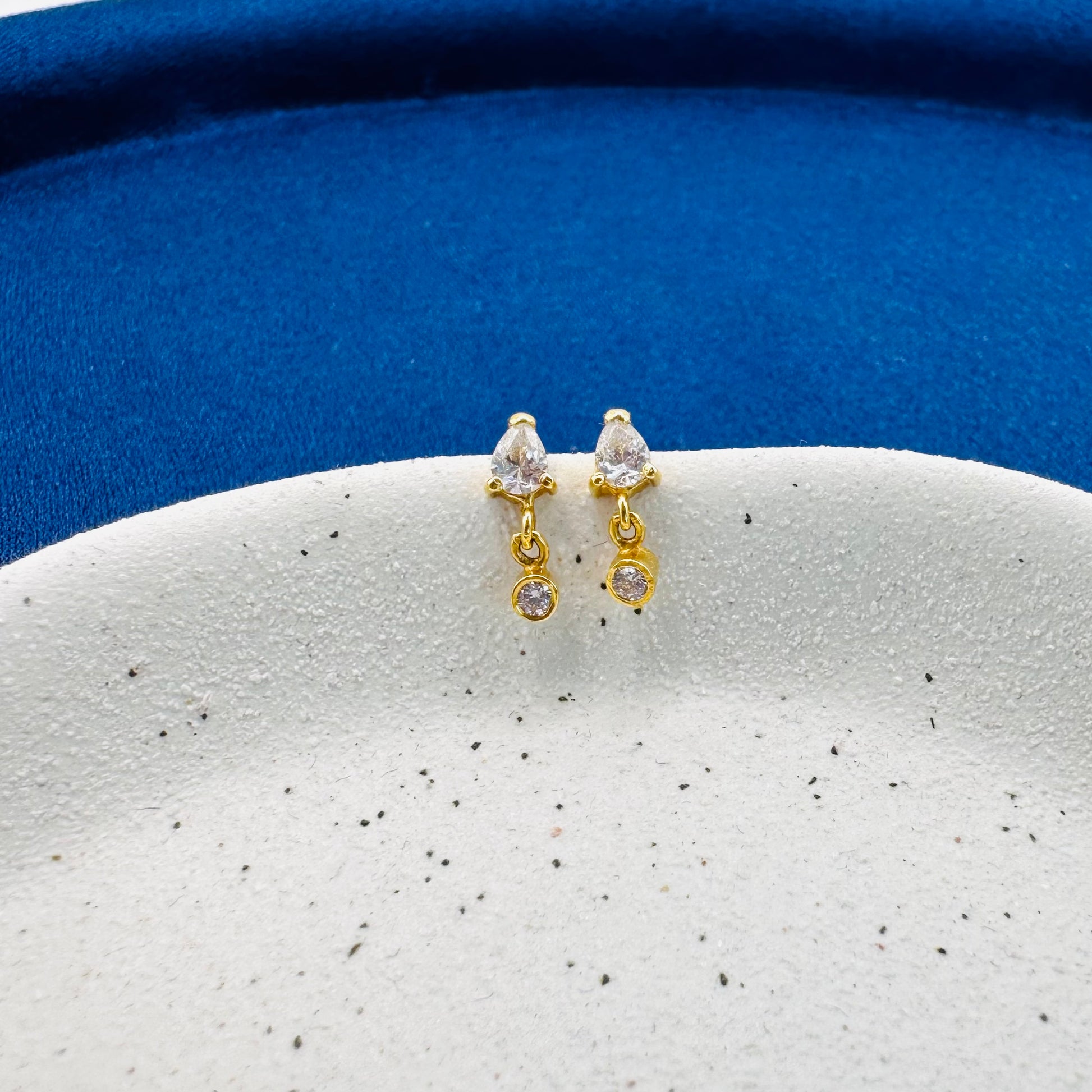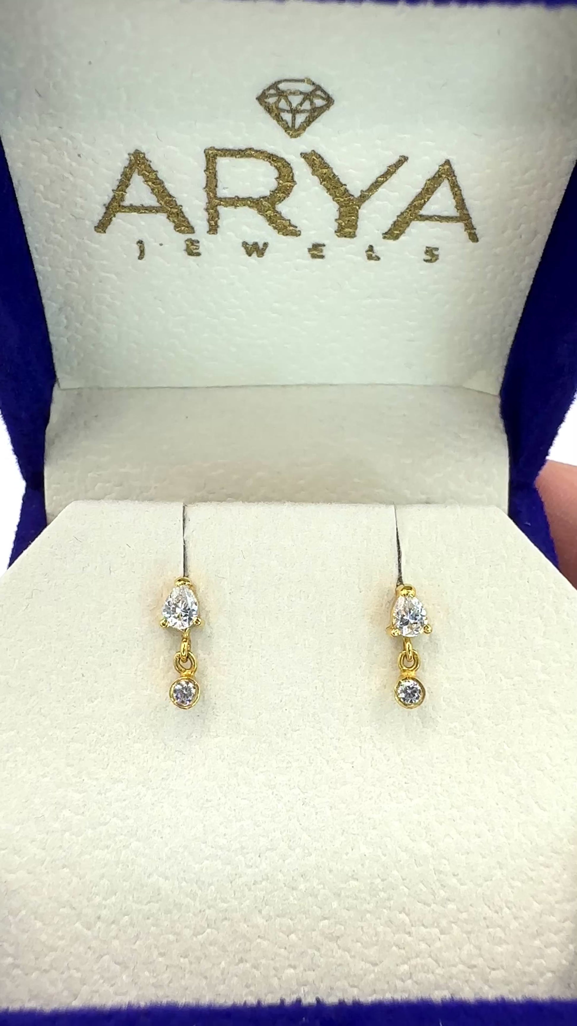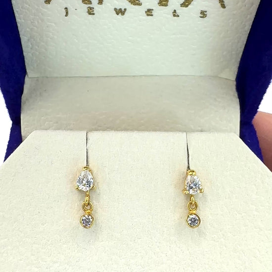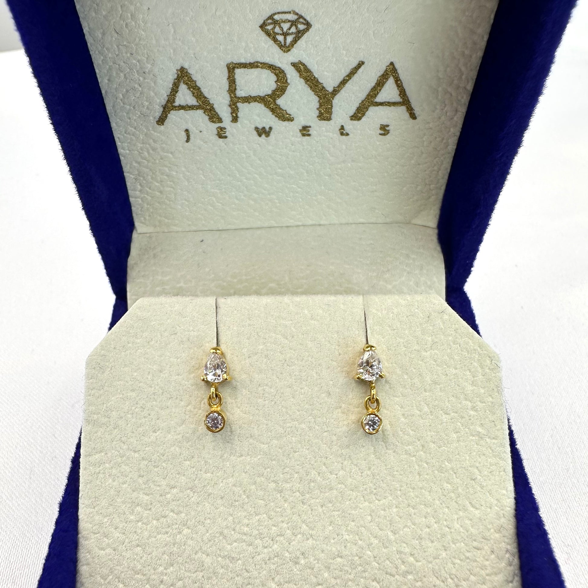 22k solid gold tear drop dangle ear studs / karabu earrings with white Cubic zirconia perfect for kids or as a second piercing.