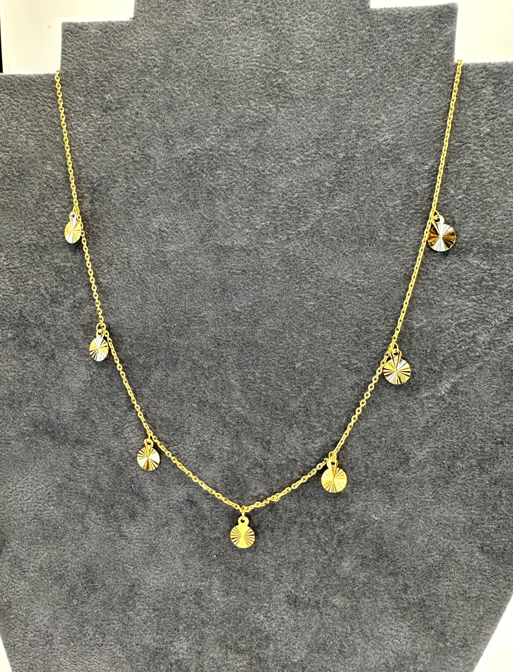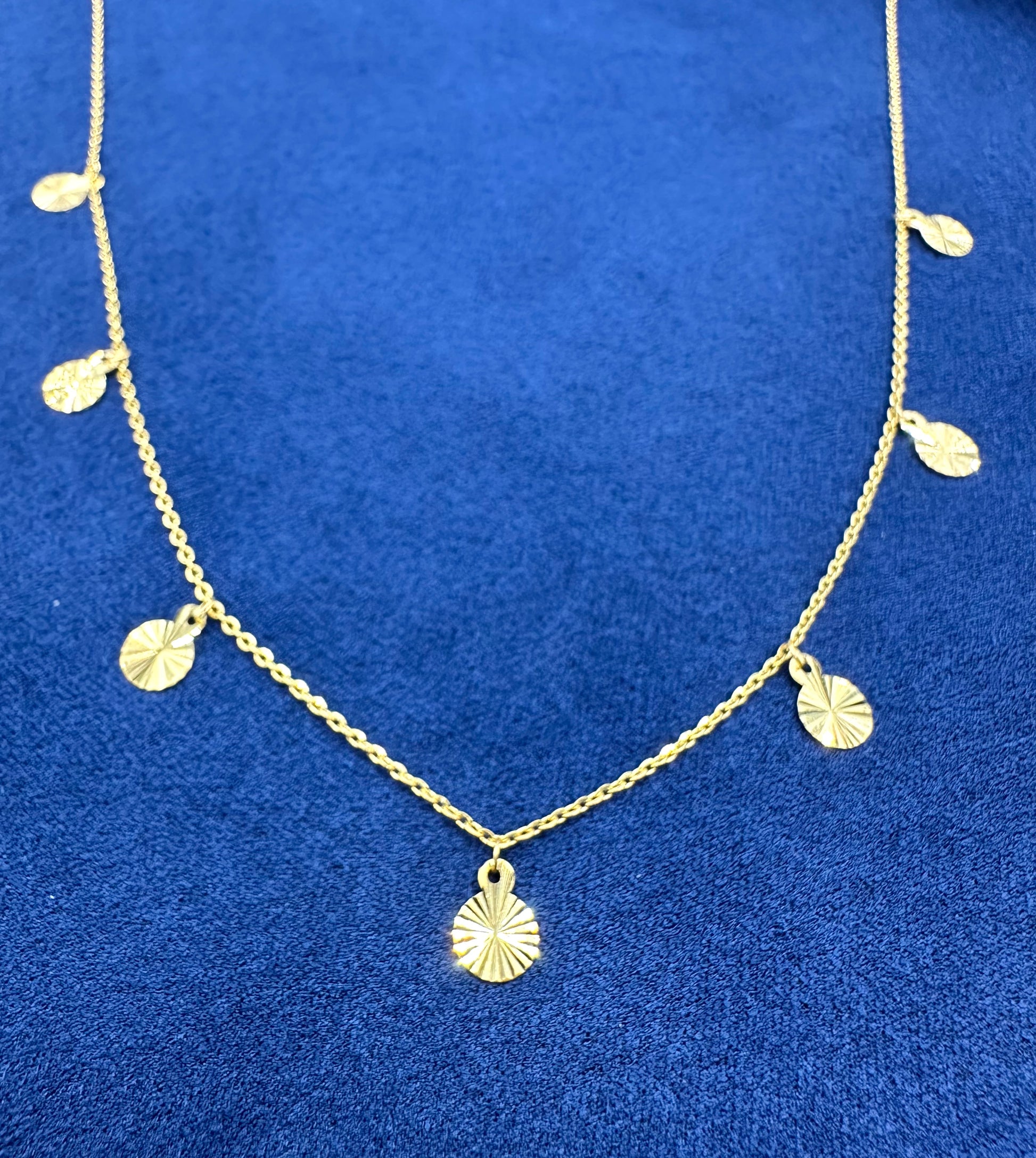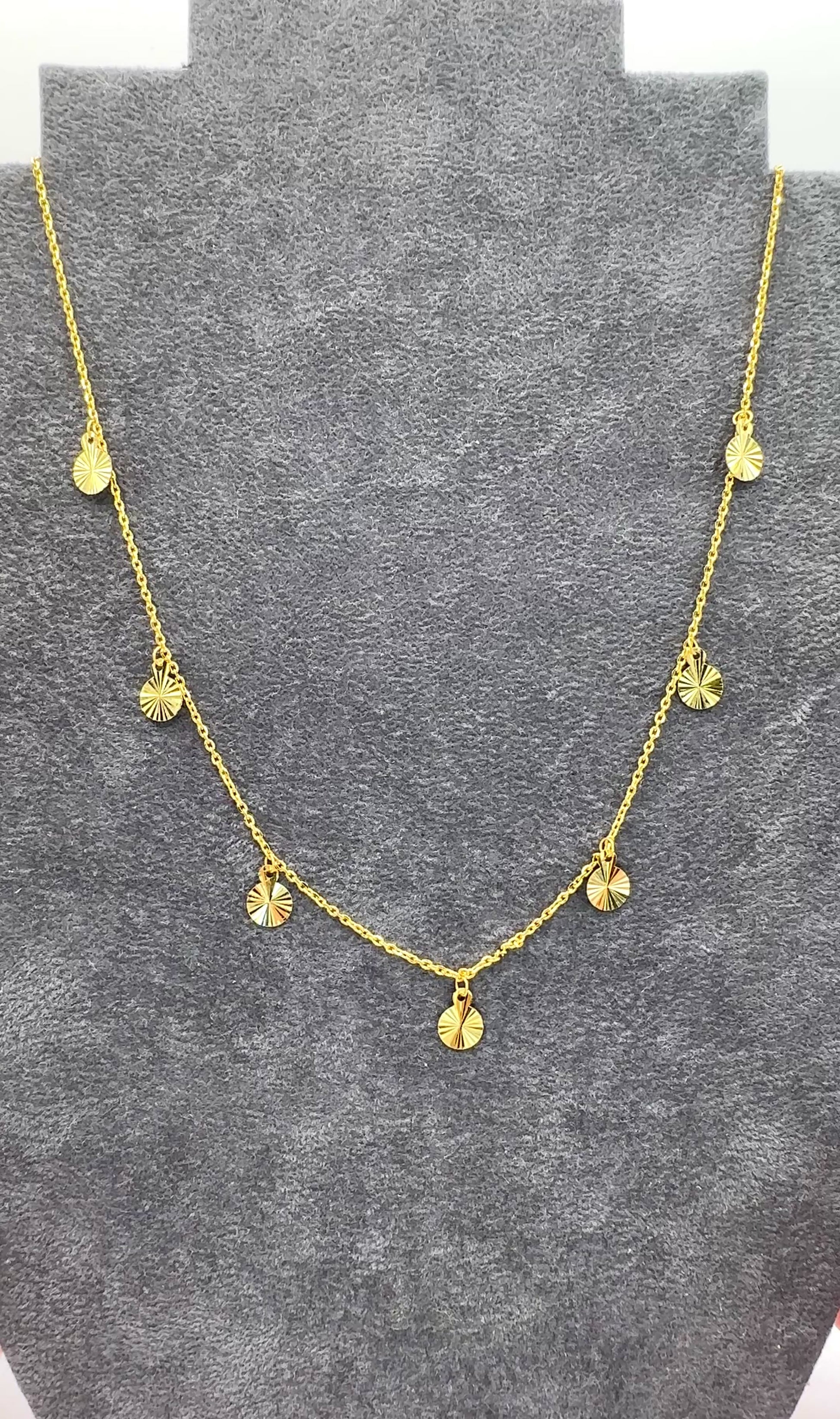 22k solid yellow gold designer necklace with dangling round disc charms - UK 916 hallmarked.