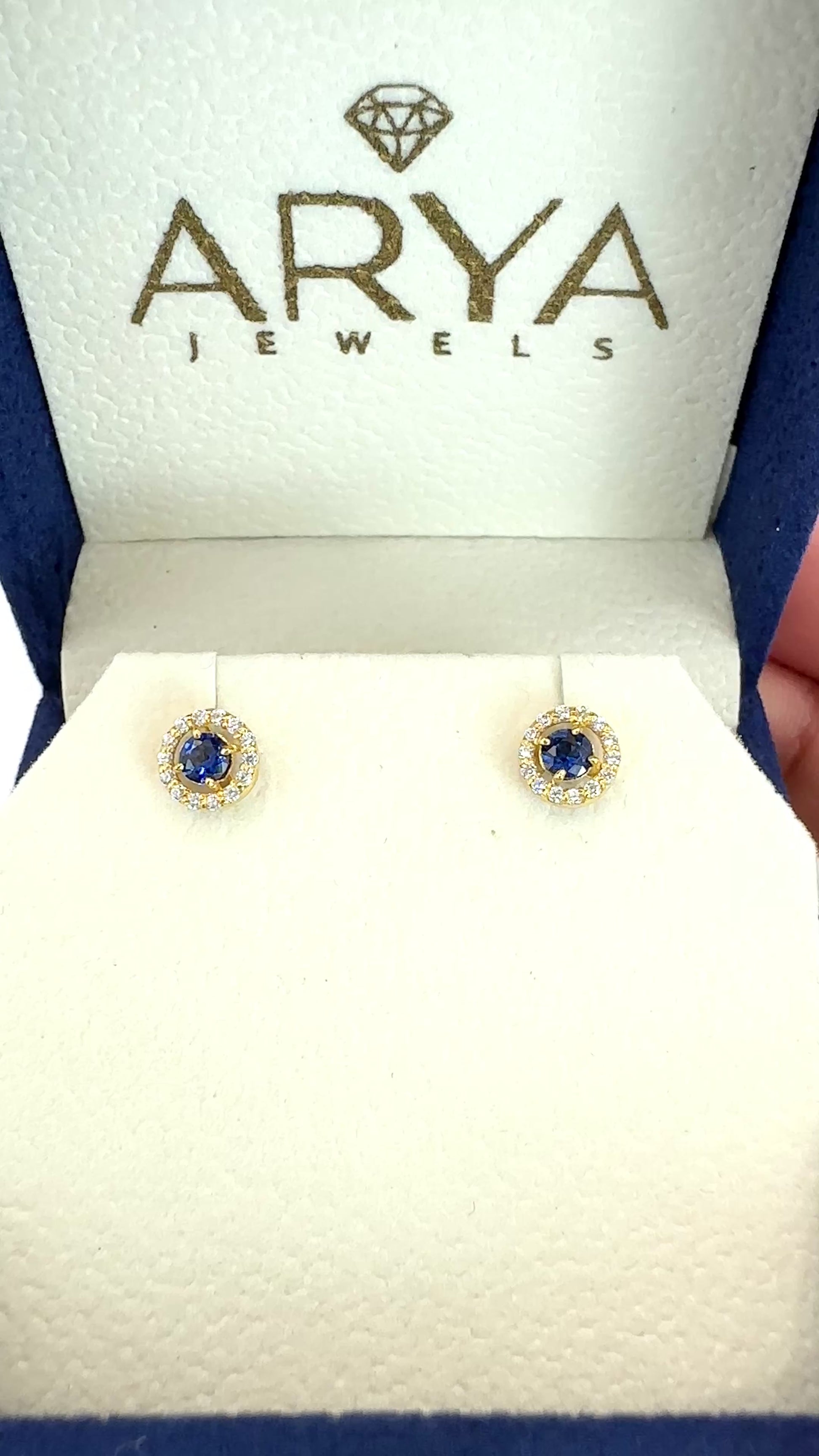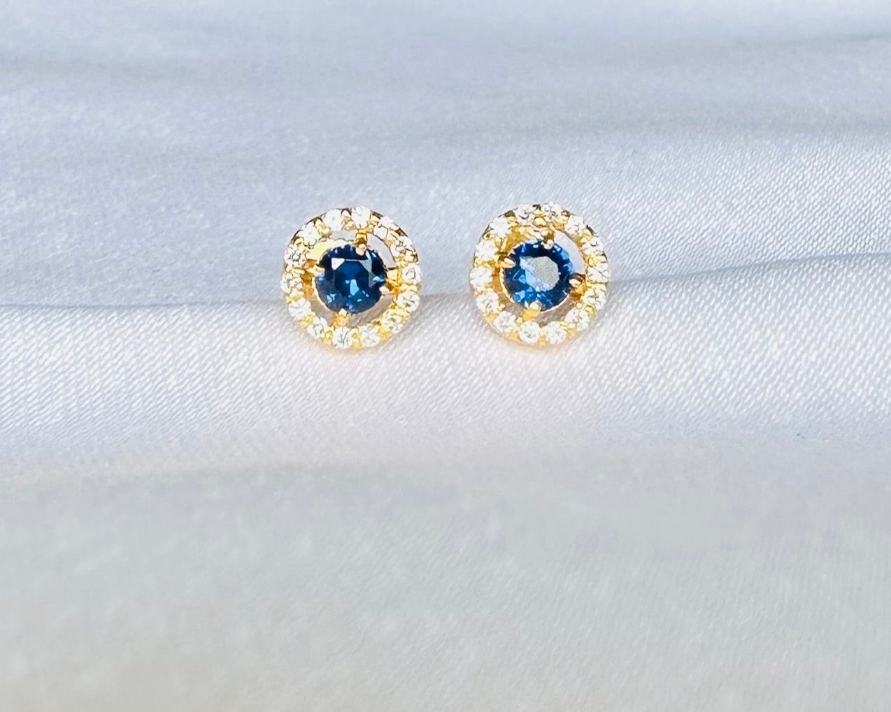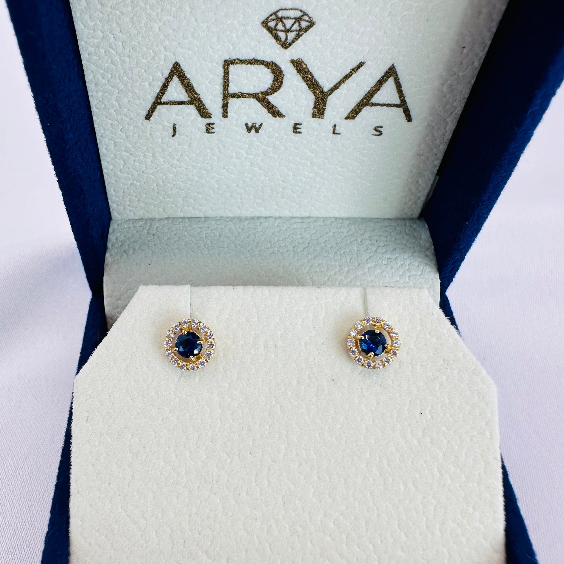 22k solid gold round earrings studded with Royal blue sapphire colour CZ and white CZ.