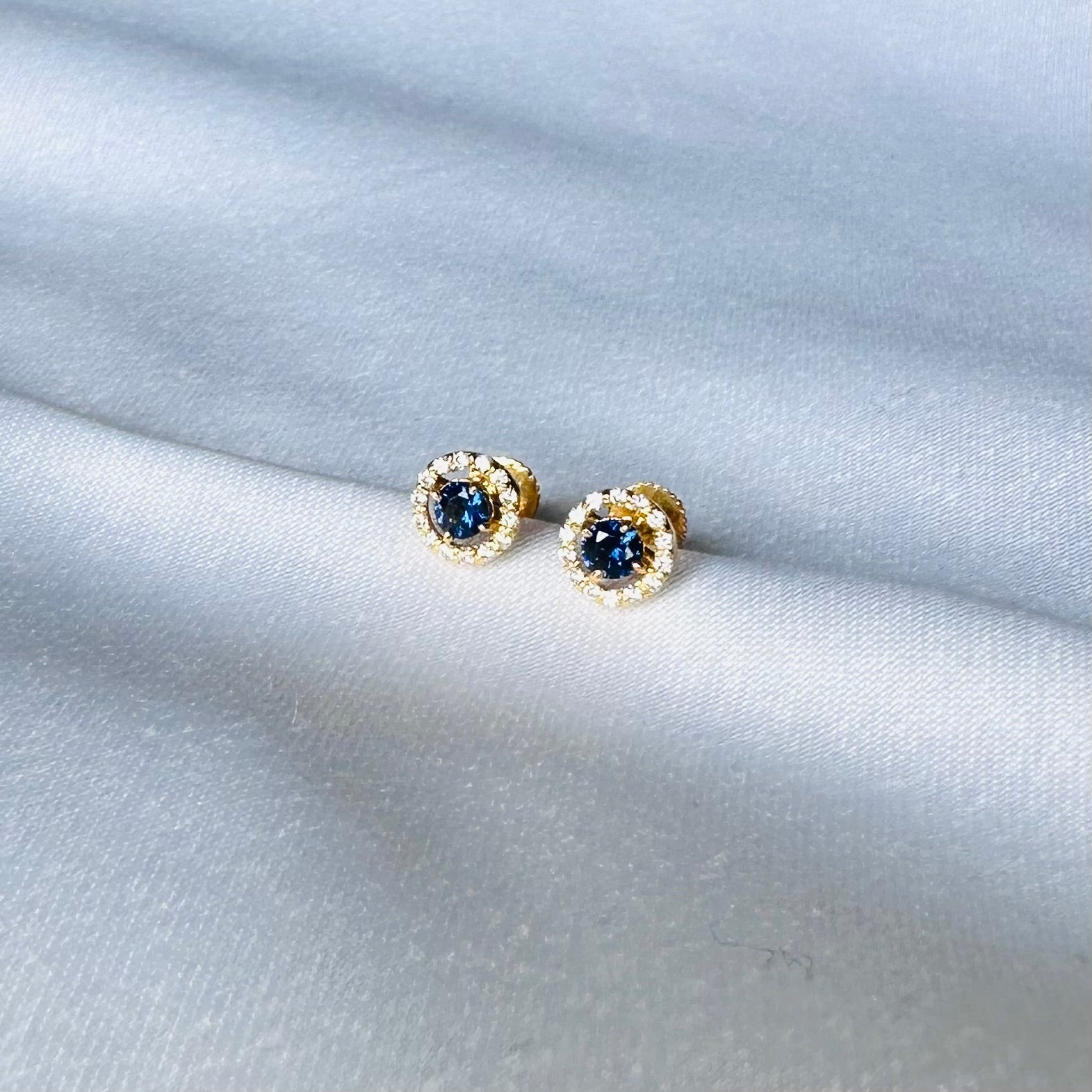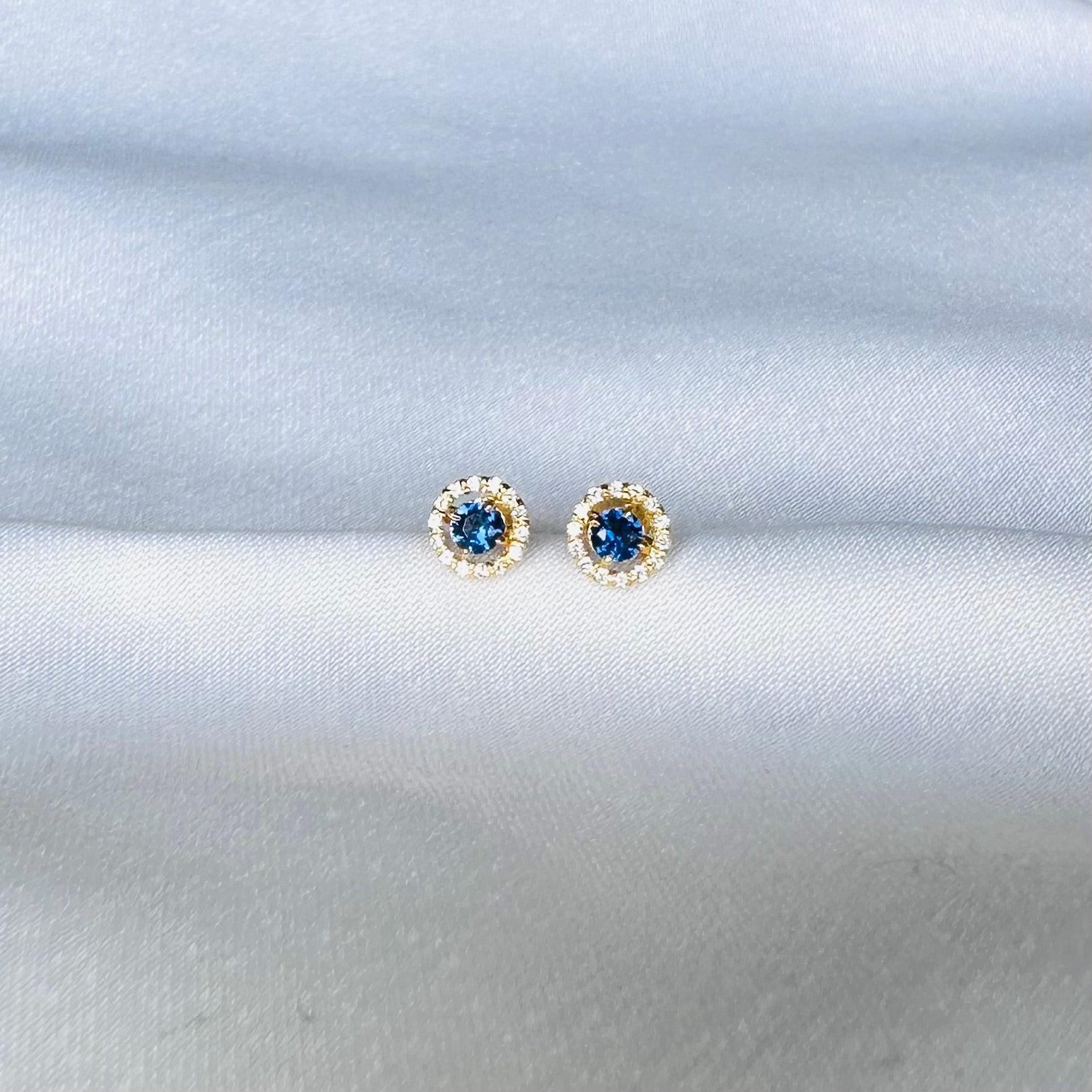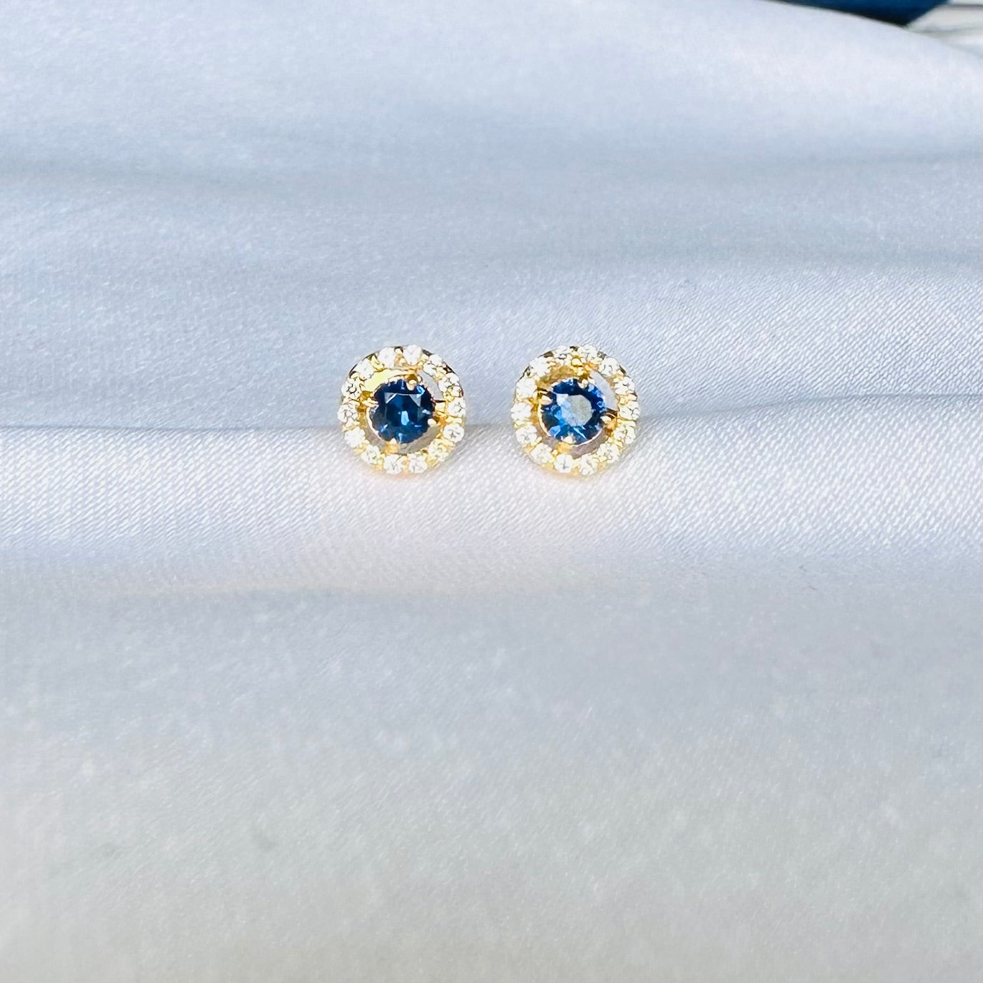 22k solid gold round earrings studded with Royal blue sapphire colour CZ and white CZ.
