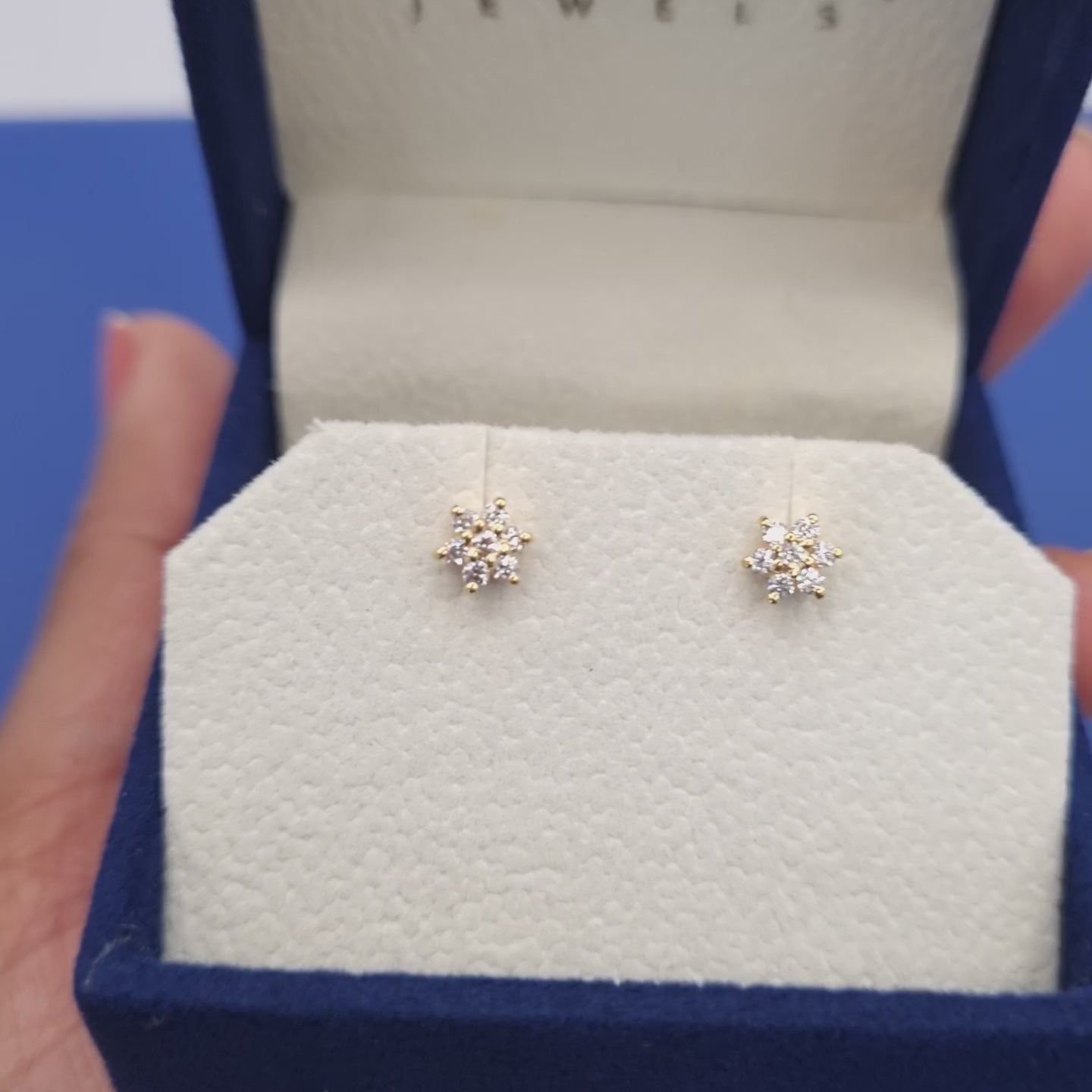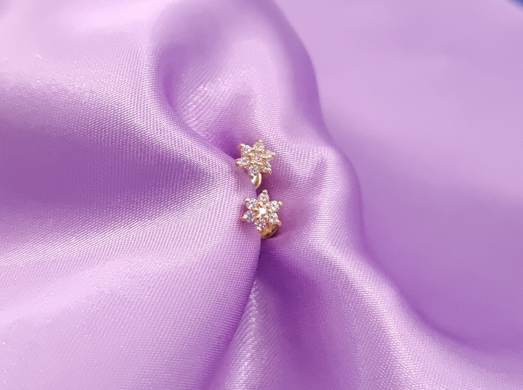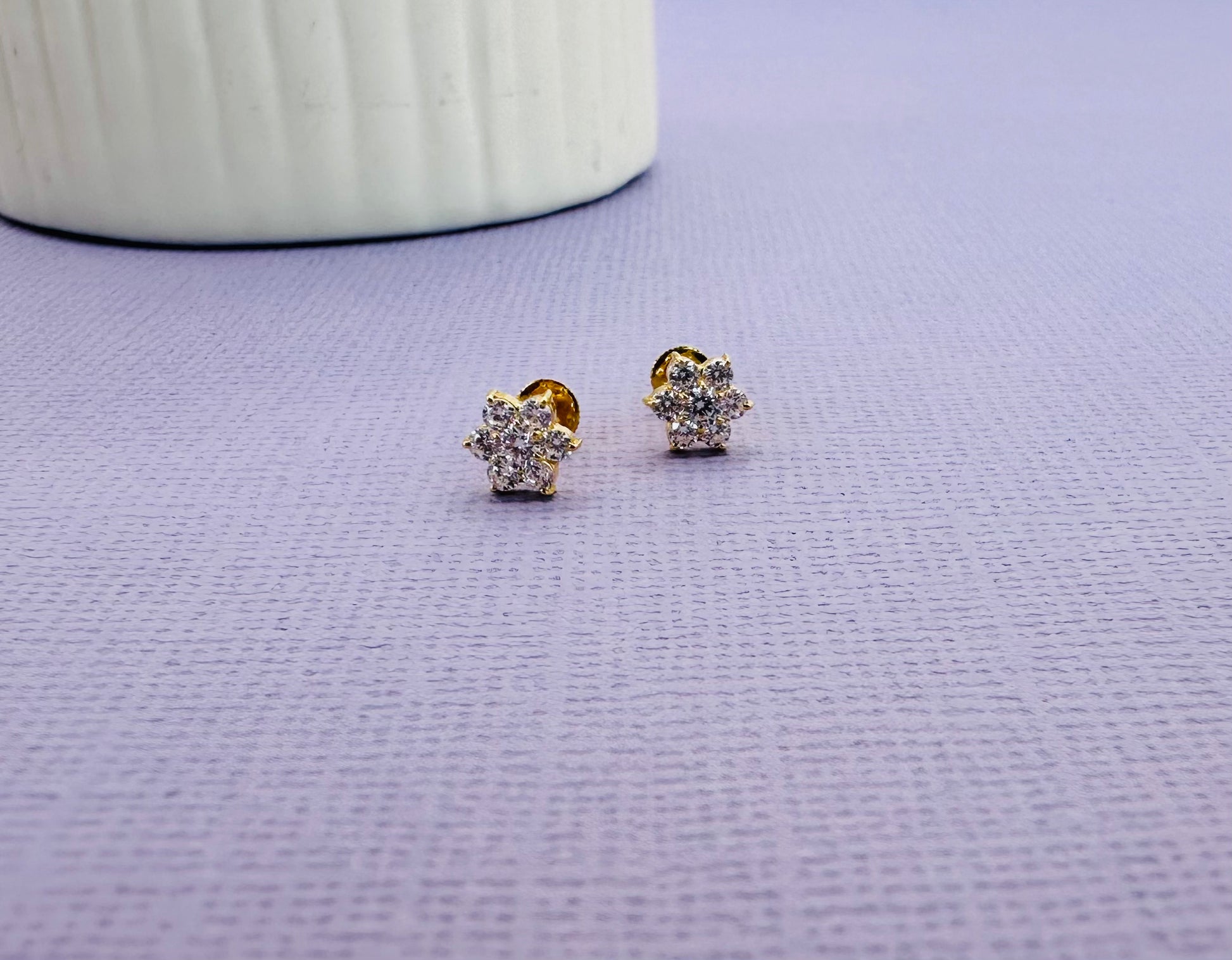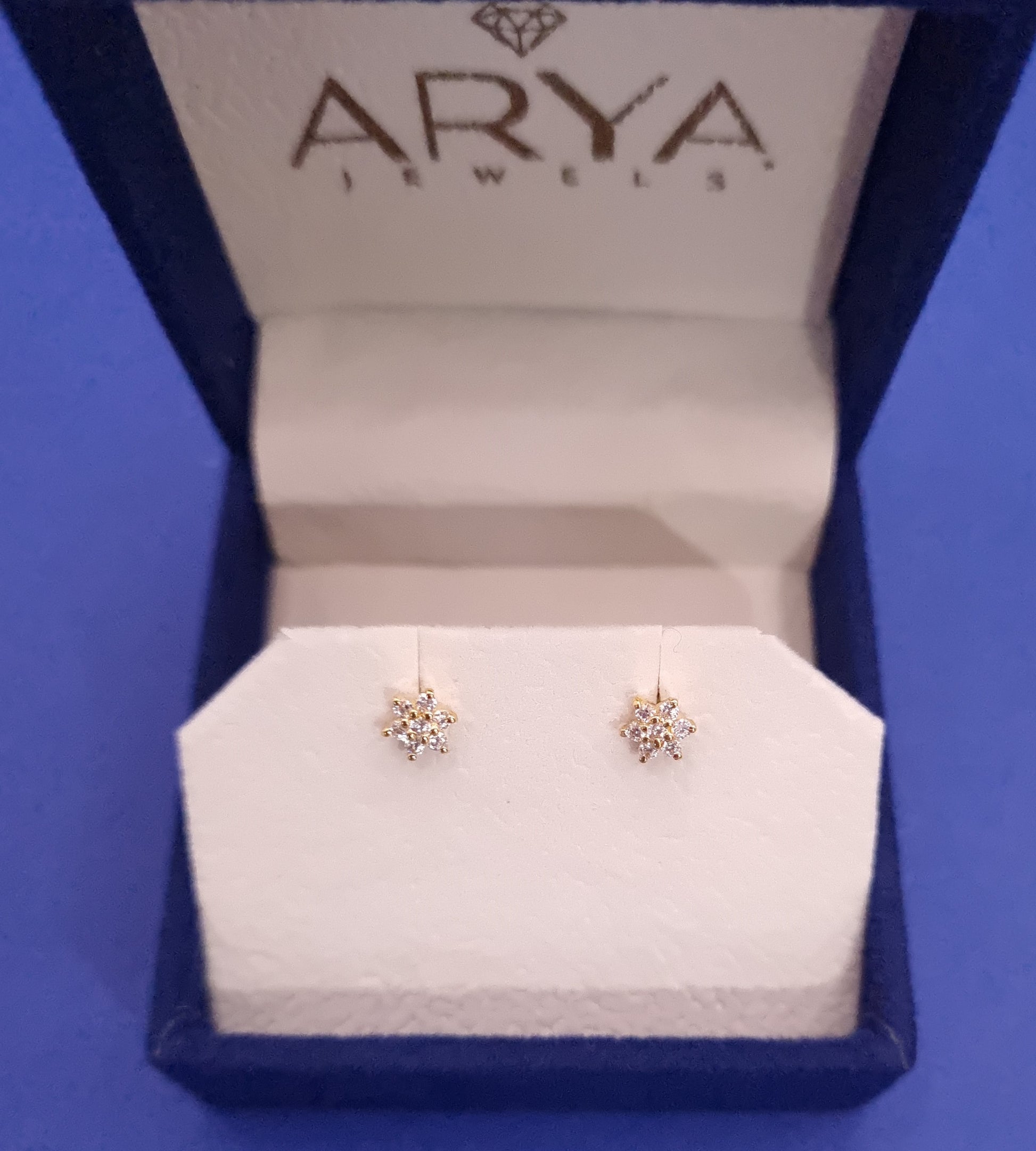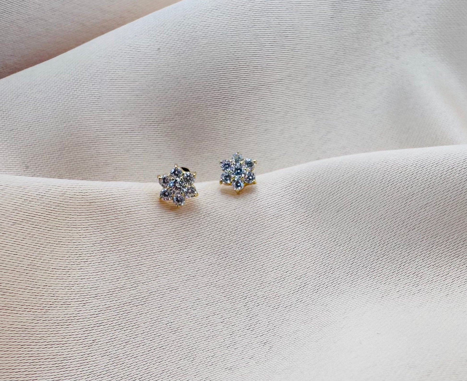 22k solid gold ear flower earrings with white cubic zirconia/ American diamond gemstones - perfect for kids and adults.