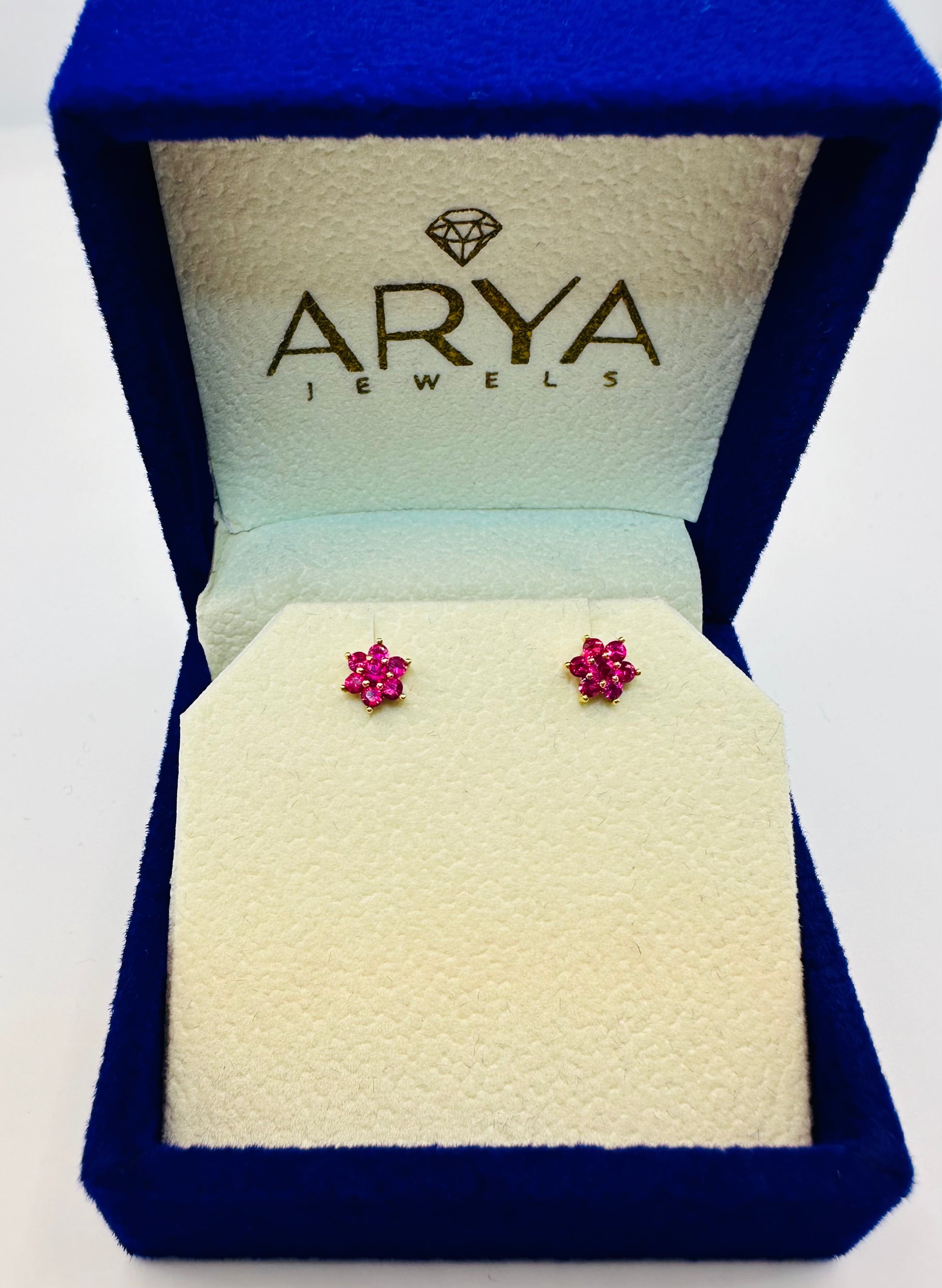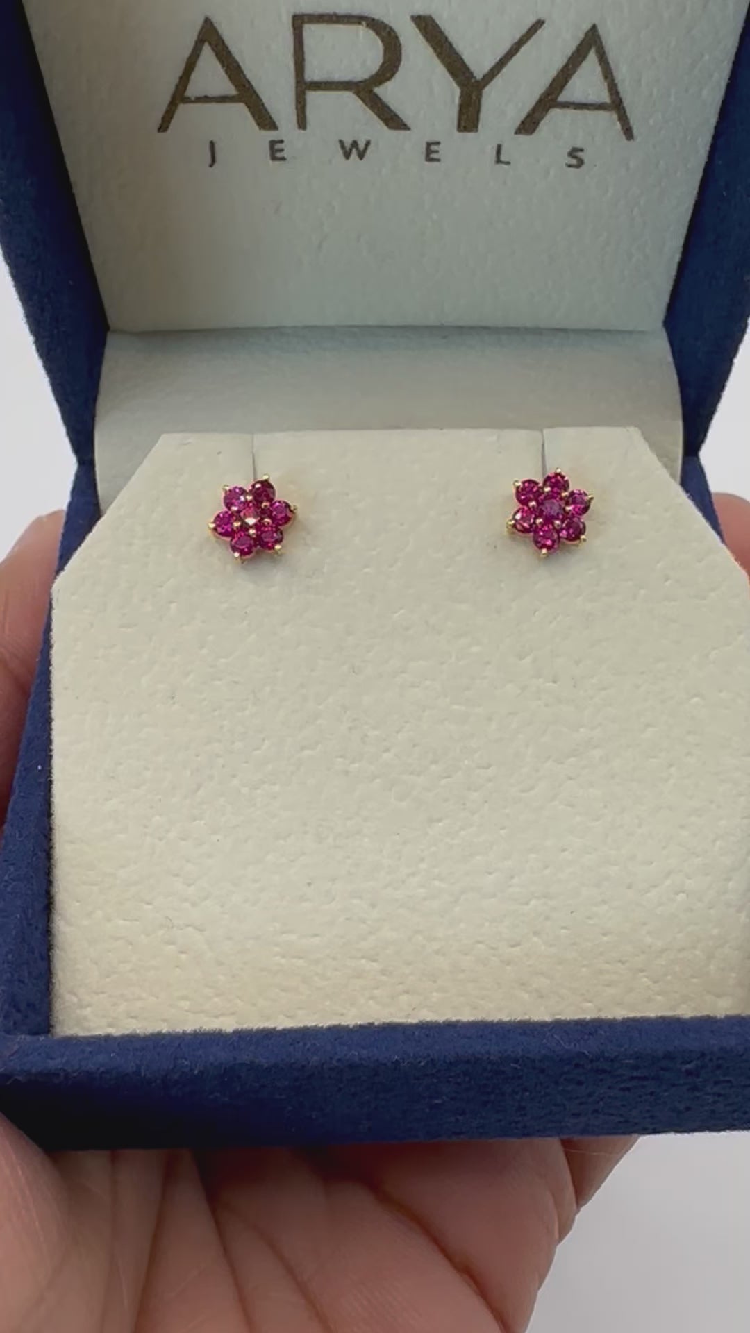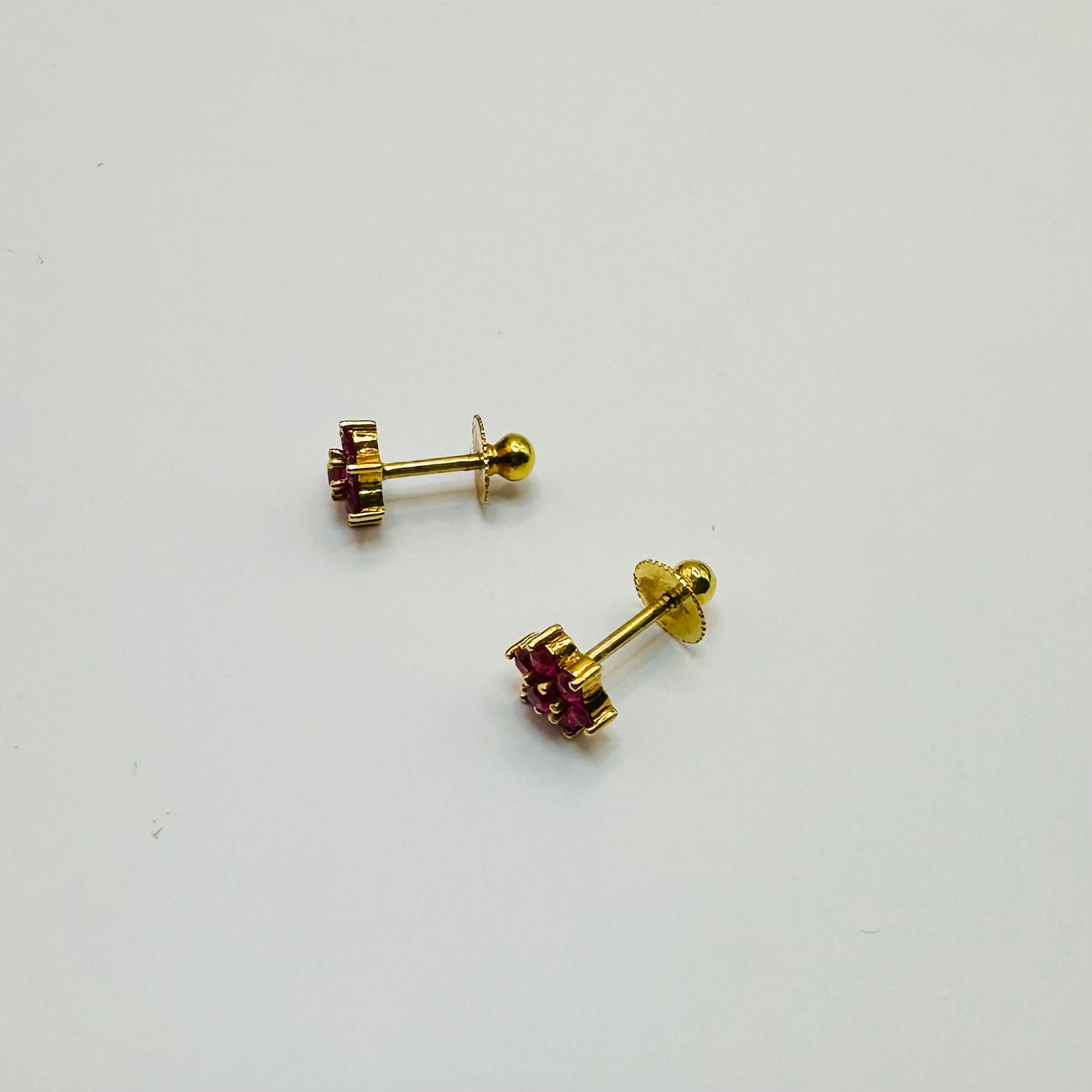 22k solid gold flower ear studs , Ruby colour cubic zirconia- perfect gift for kids and adults - British 916 hallmark.