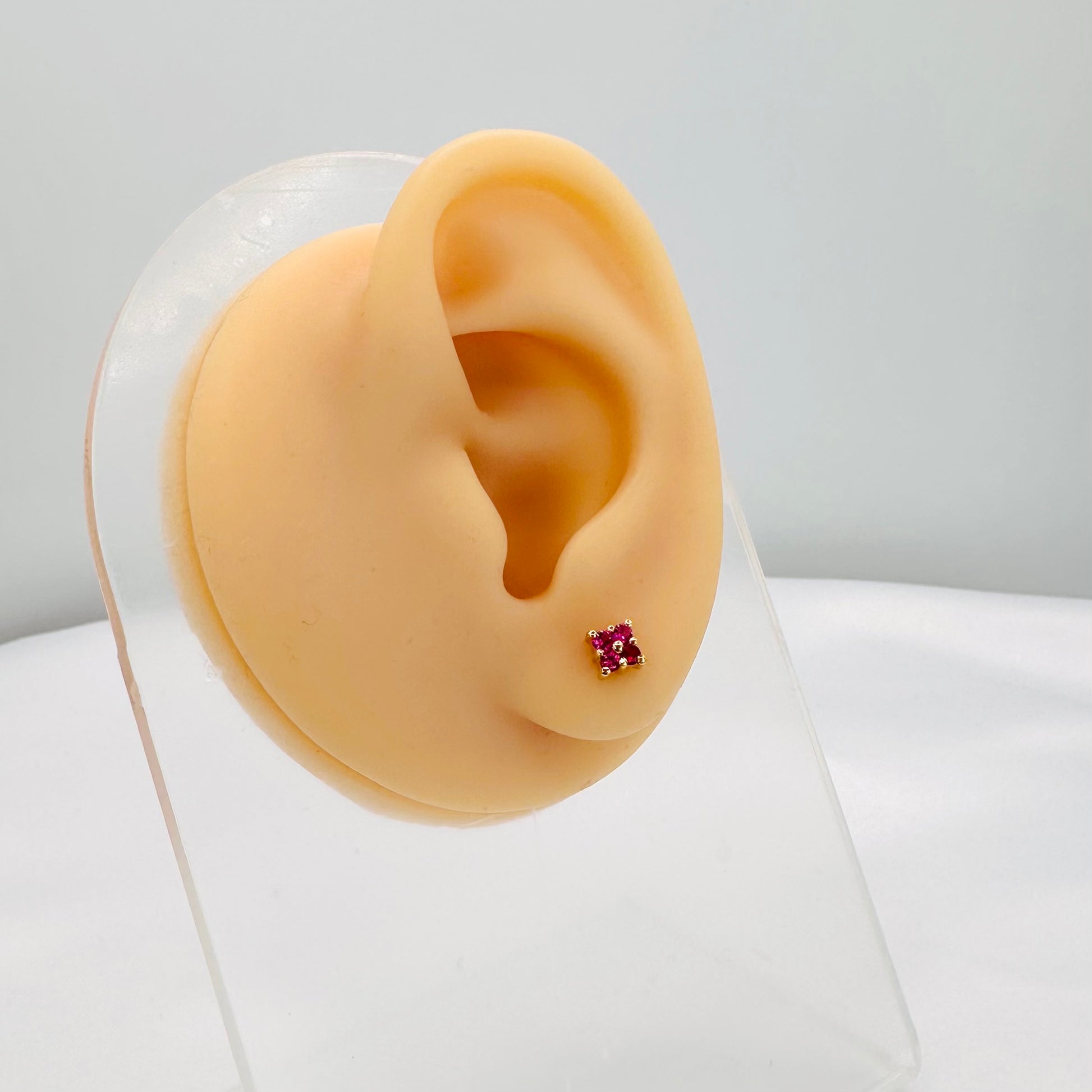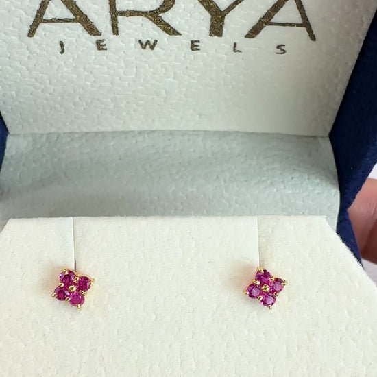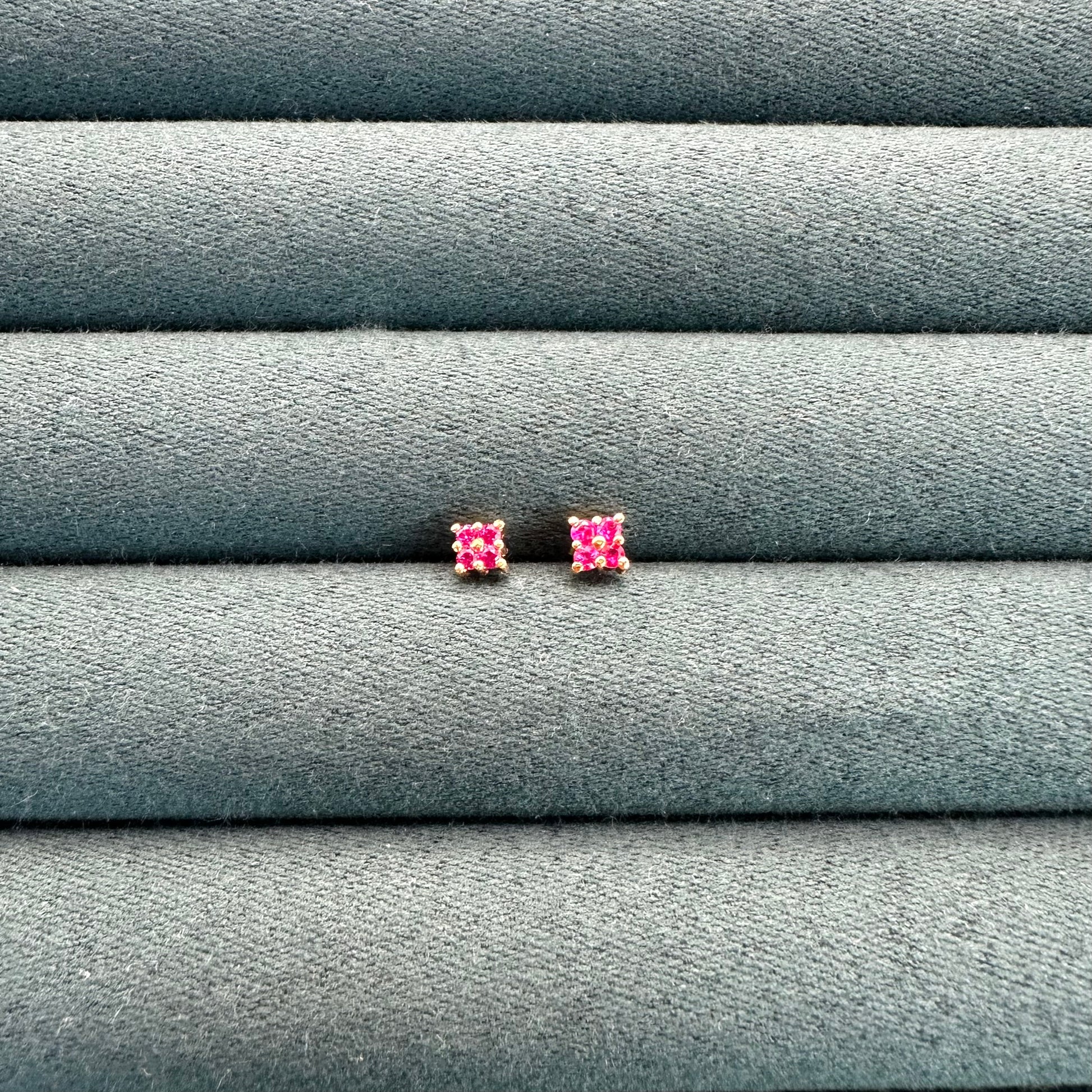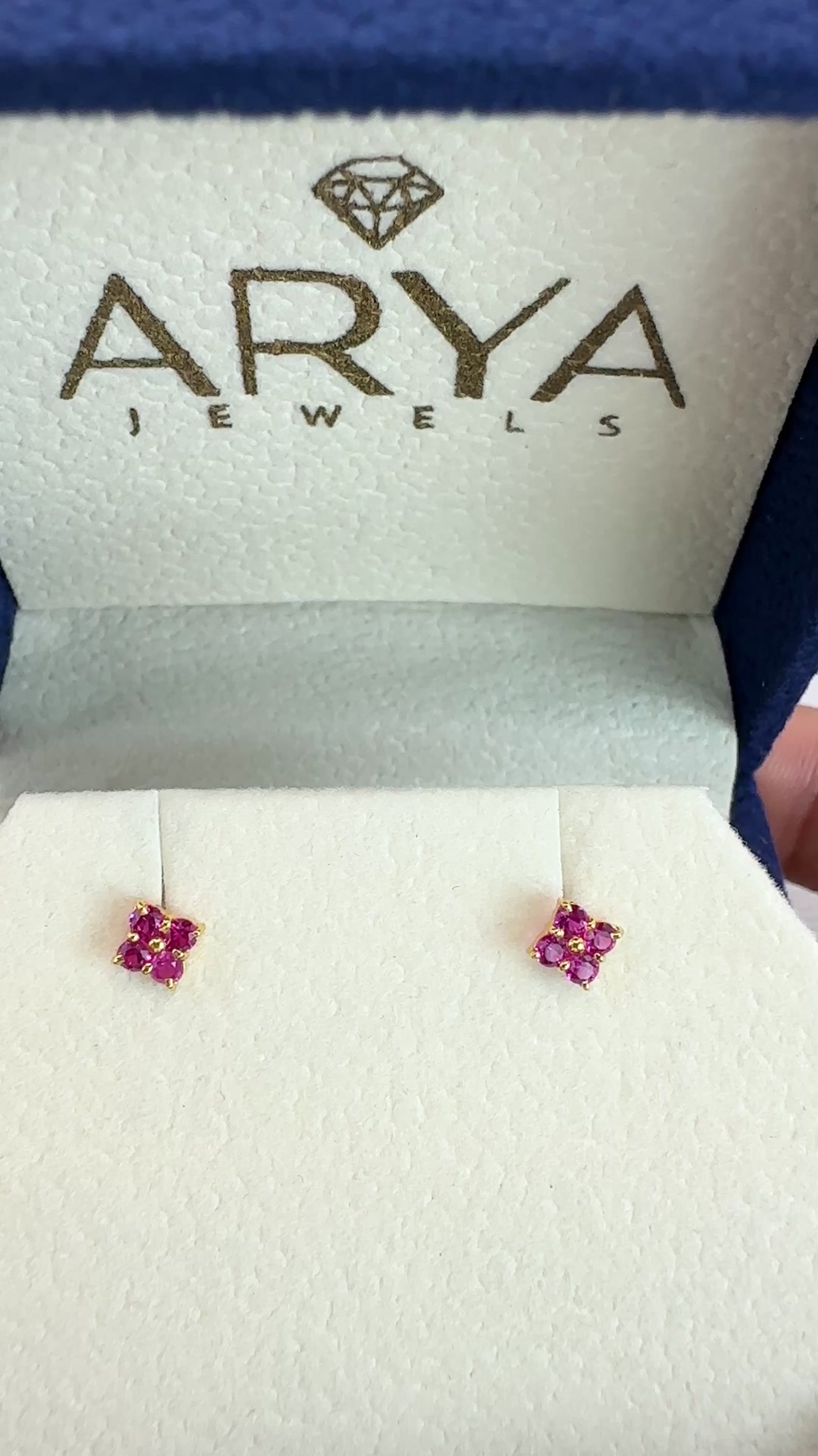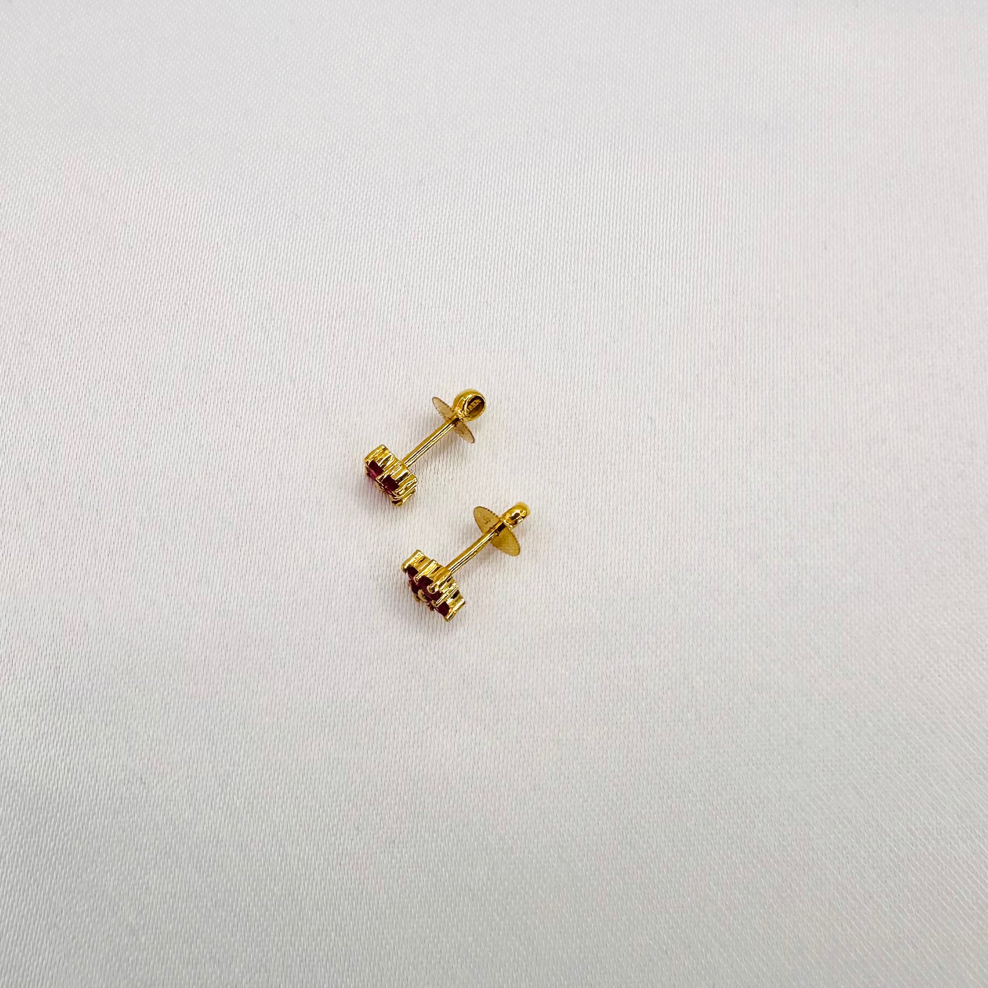 22k solid gold small ear studs with four ruby coloured CZ gemstones- perfect gift for kids and adults.