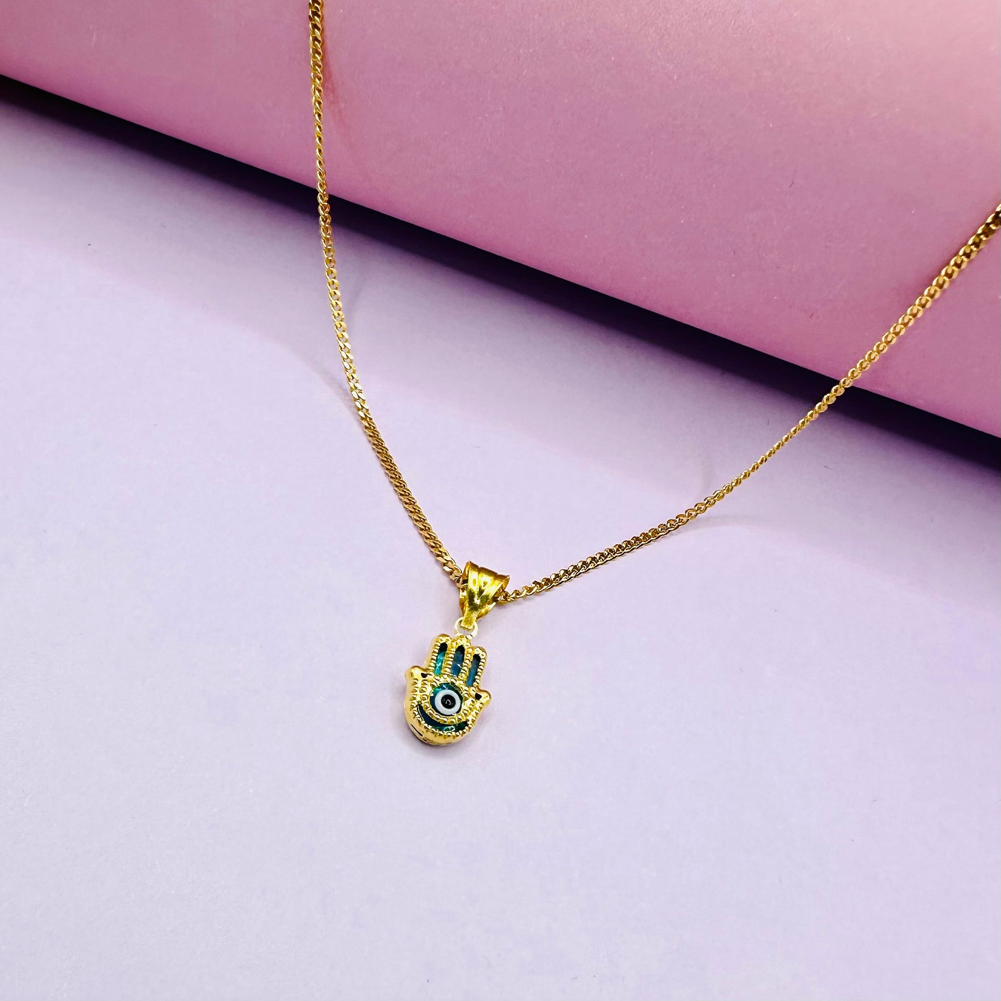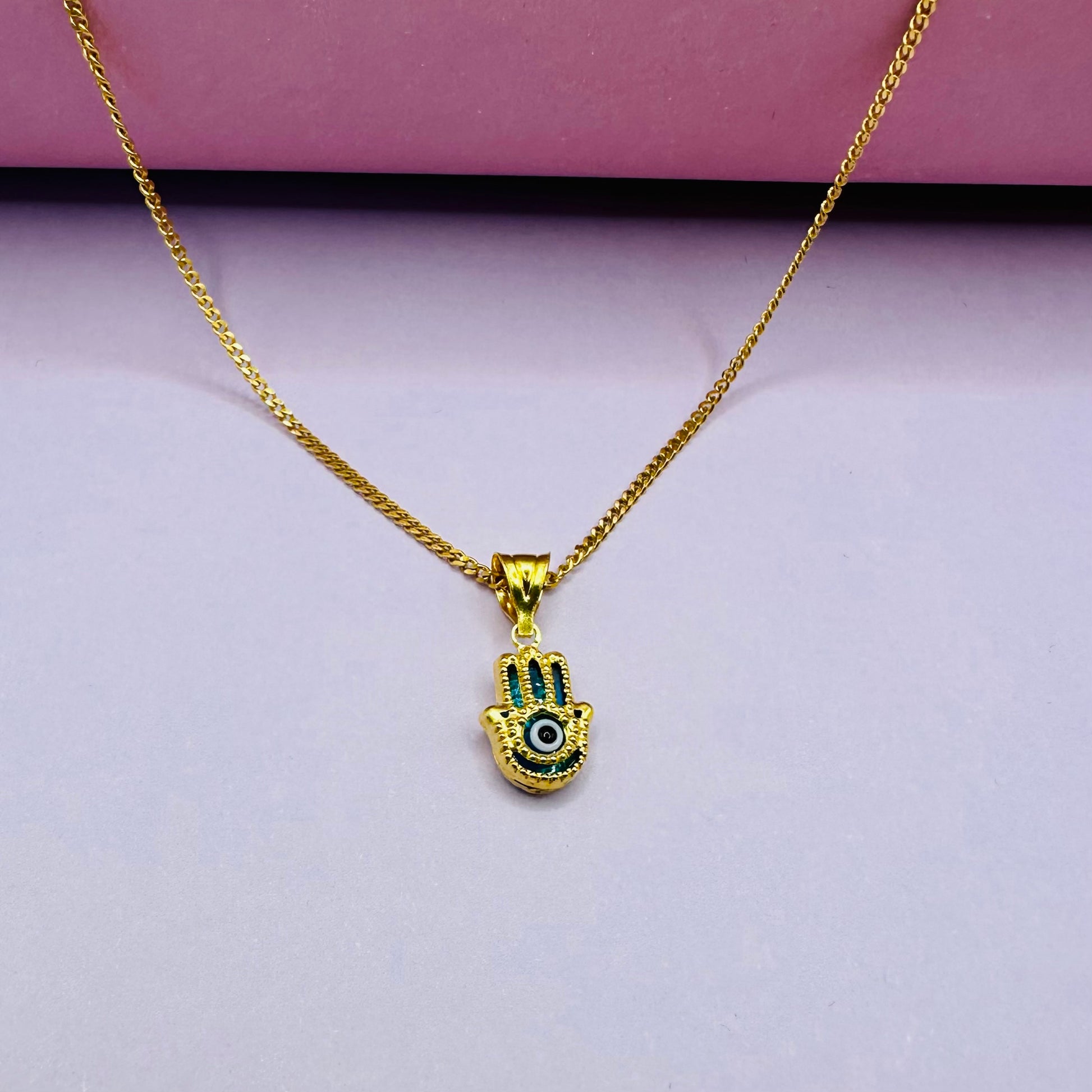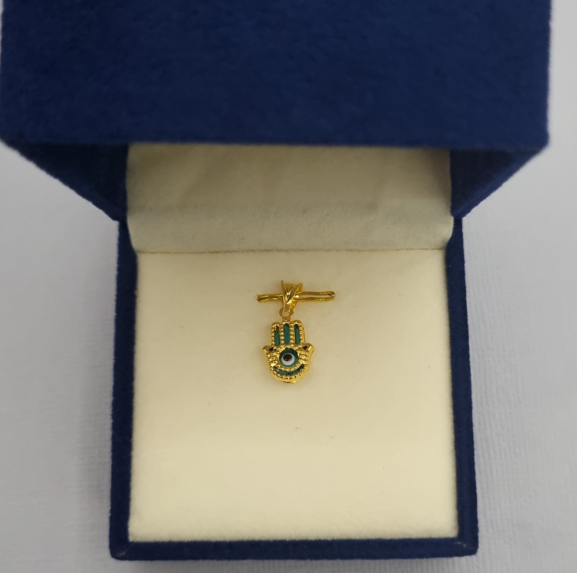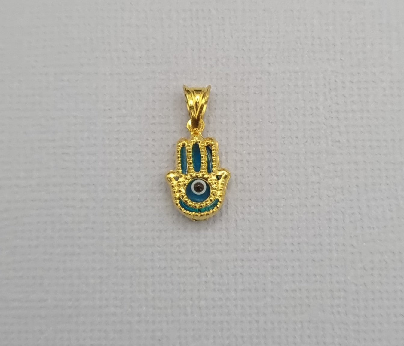 Beautiful small hamsa/evil eye pendants (only) are 22k solid gold with blue enamel.