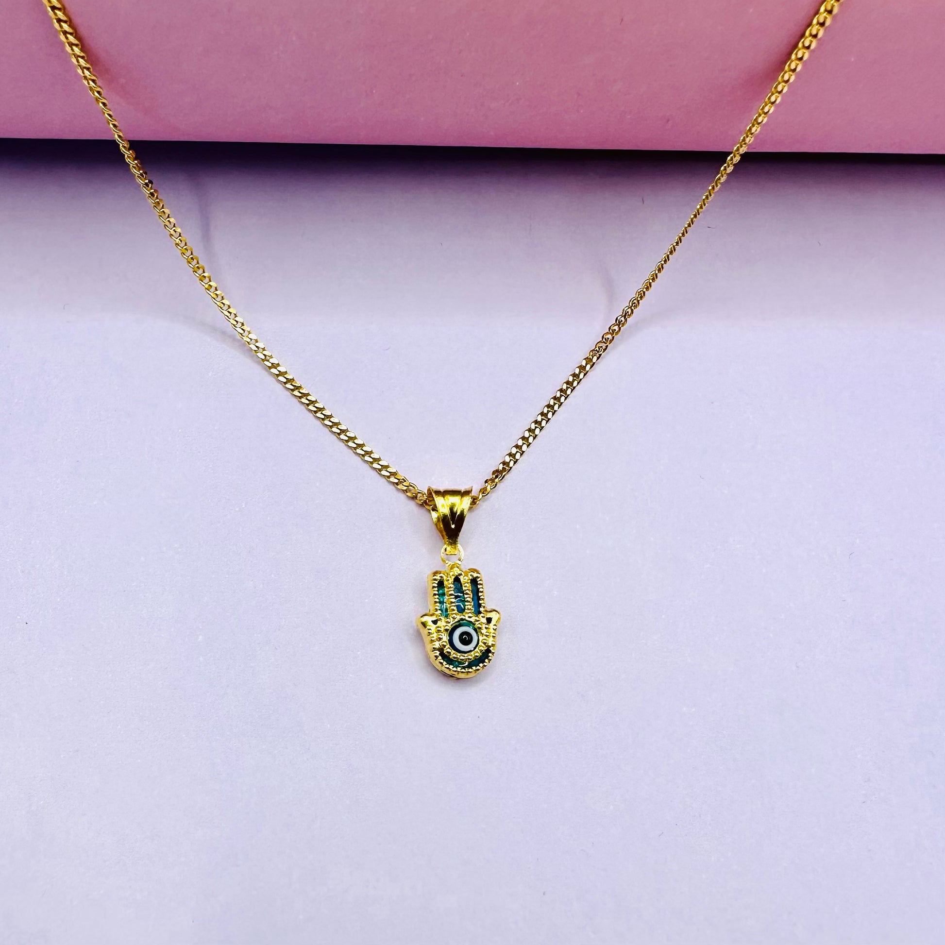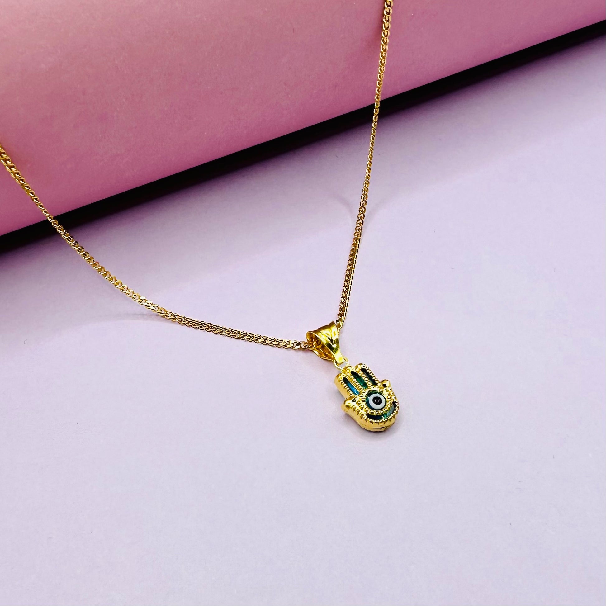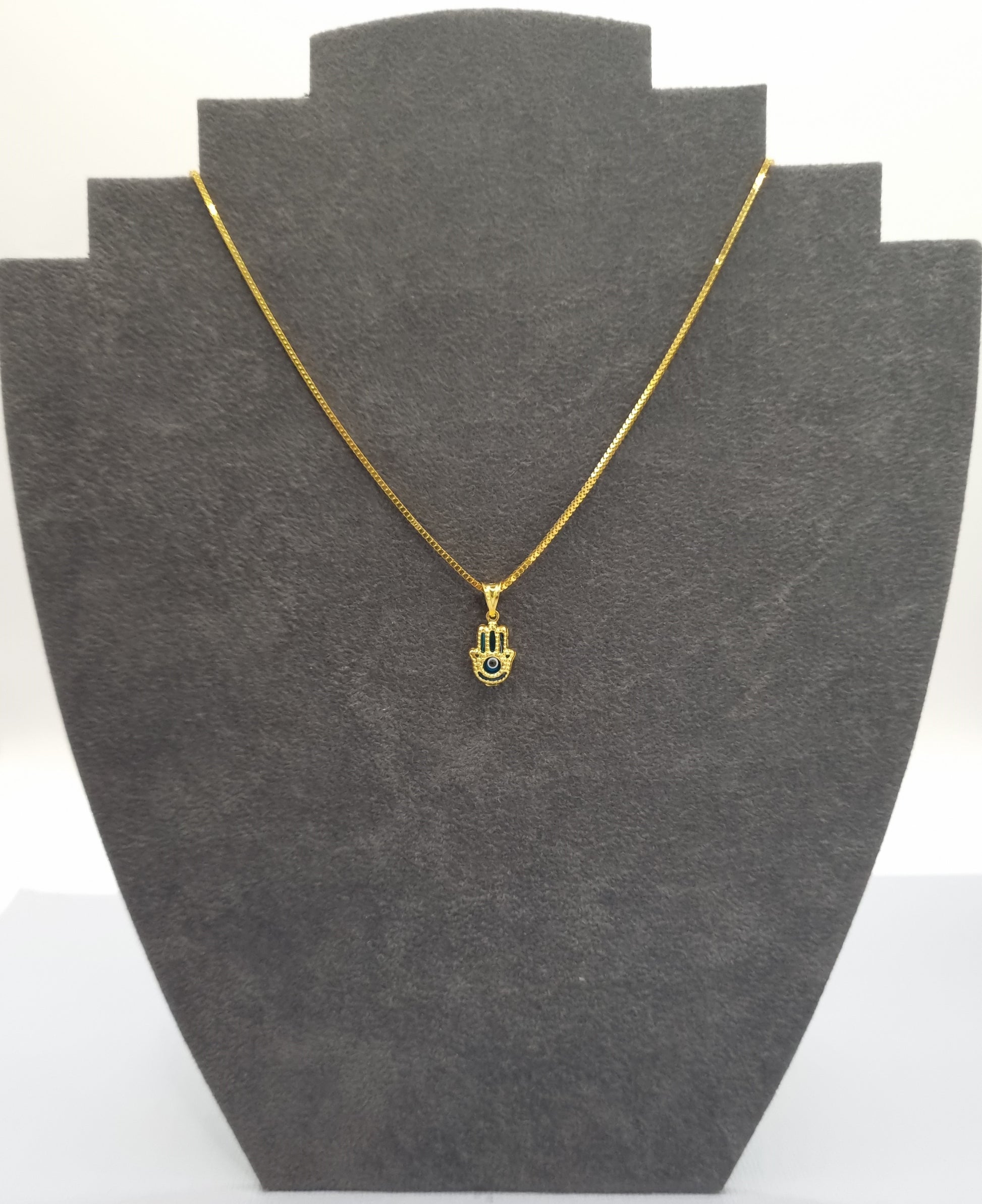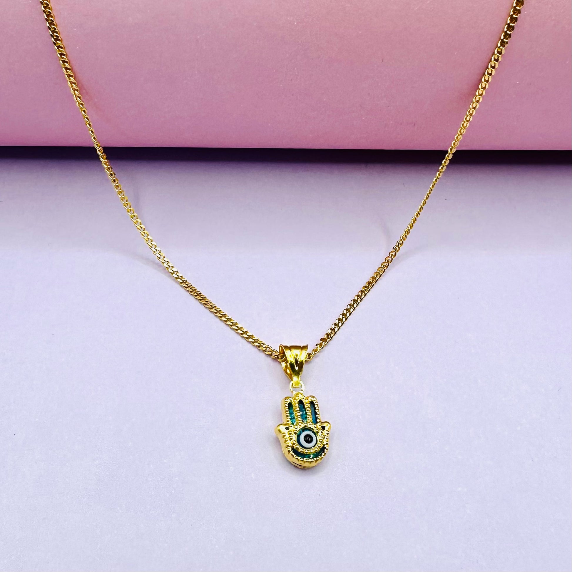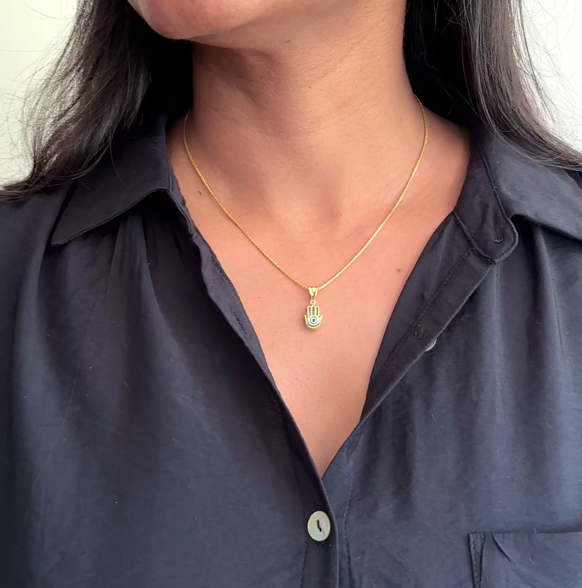 Beautiful small hamsa/evil eye pendants (only) are 22k solid gold with blue enamel.